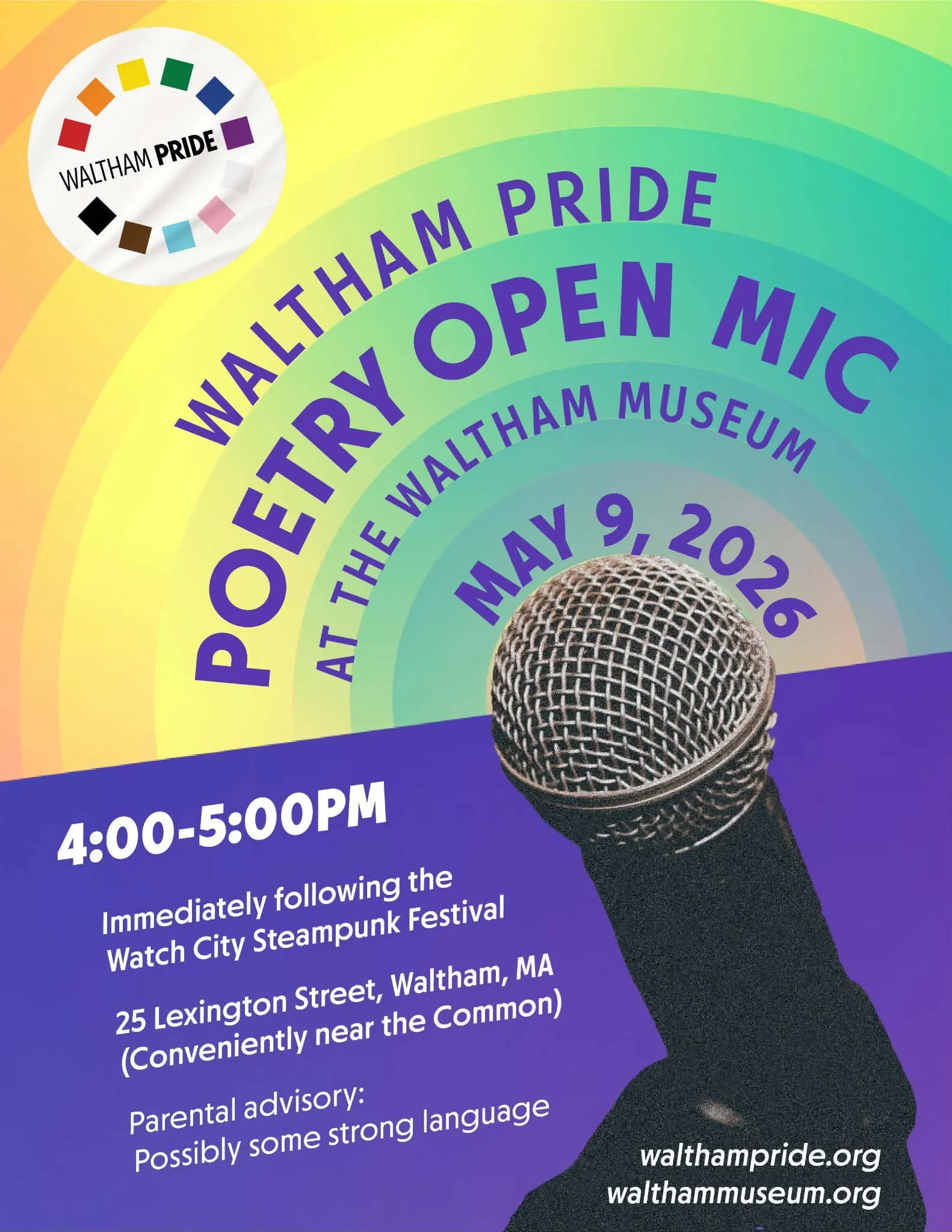 Join Waltham Pride for a poetry open mic event at The Waltham Museum! The event will run from 4:00pm to 5:00pm inside The Waltham Museum at 25 Lexington Street, very near Waltham Common.