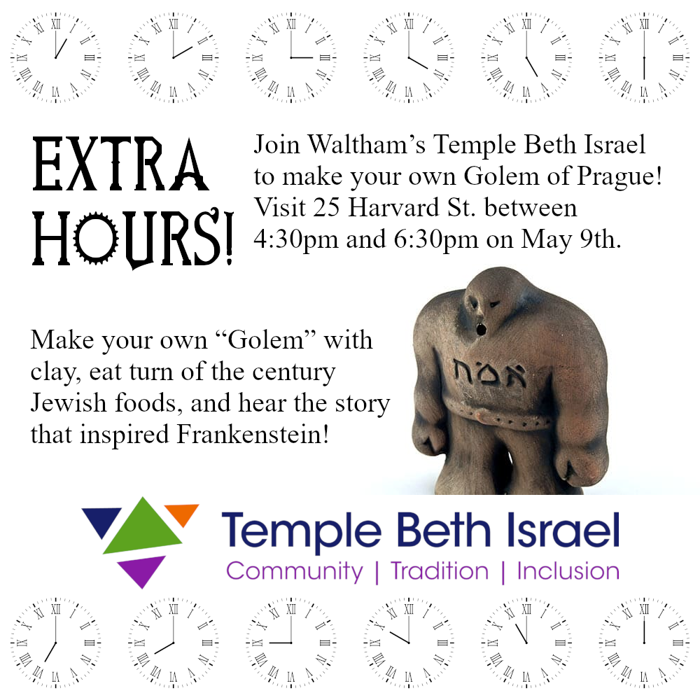 Join Waltham’s Temple Beth Israel to make your own Golem of Prague! Make your own “Golem” with clay, eat turn of the century Jewish foods, and hear the story that inspired Frankenstein all on our front lawn!